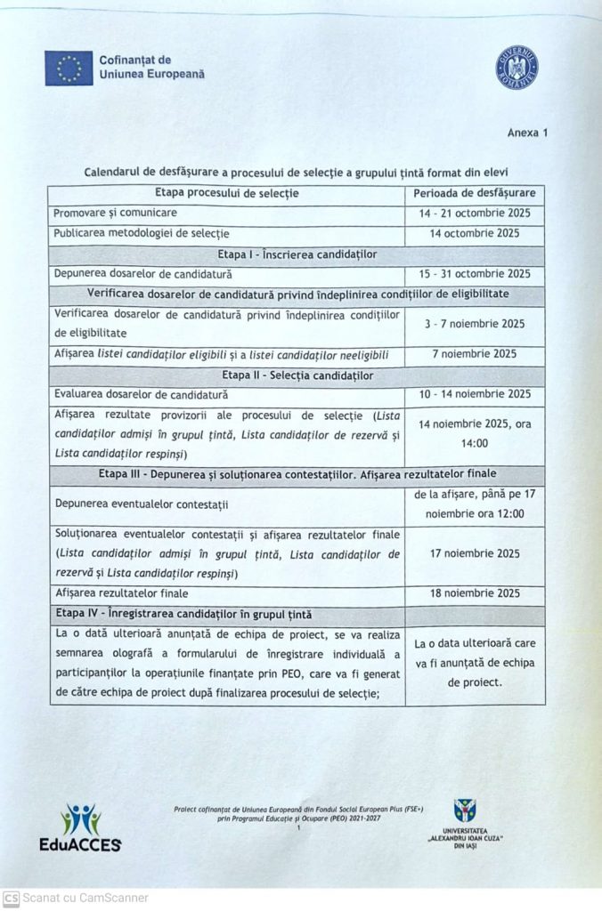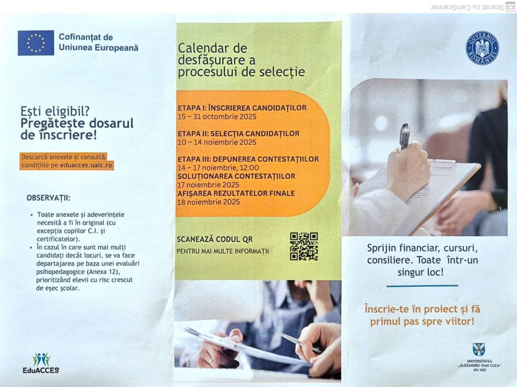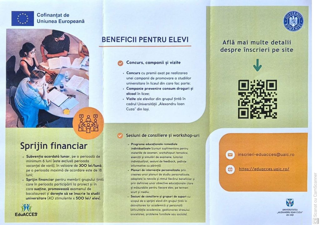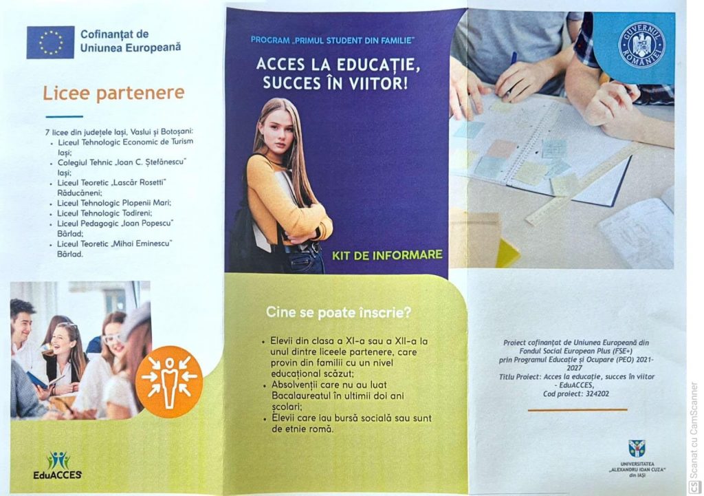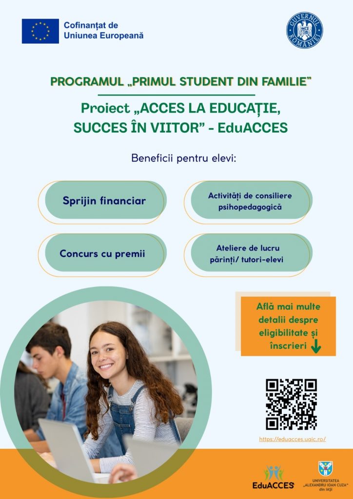 Școala noastră este unul dintre cei 7 parteneri selectați la nivel național, să implementeze, în perioada următoare, proiectul„Acces la educație, succes în viitor! EduACCES“-Primul student în familie, cofinanțat de Uniunea Europeană și coordonat de UAIC, Iașicare urmărește sprijinirea unui număr de 352 de tineri, din care 162 de elevi și absolvenți de liceu din promoțiile anterioare care nu au promovat examenul de bacalaureat și 190 de studenți, în special cei proveniți din familii cu nivel educațional scăzut al părinților.